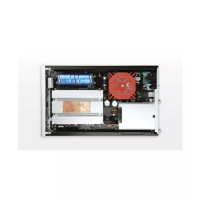Il intègre une alimentation linéaire entièrement dédiée à la section audio, offrant une tension stable et propre. Associée à une mini-onduleur à supercondensateurs, elle assure une protection efficace contre les coupures de courant et les interférences. Le châssis en aluminium brossé usiné dans la masse renforce la stabilité et l’élégance du boîtier, tout en limitant les vibrations et les bruits parasites.