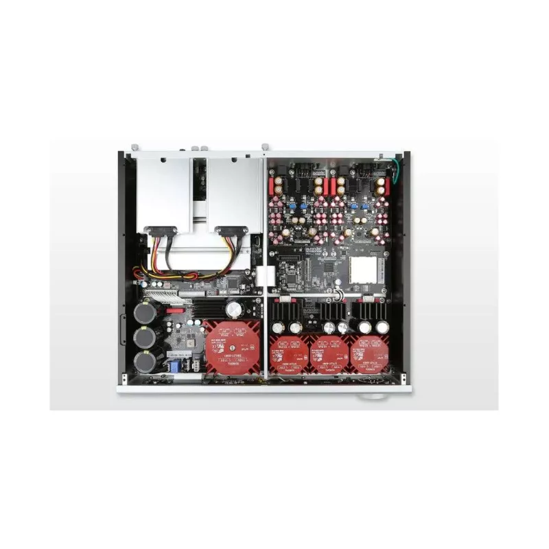 L’alimentation linéaire est séparée des circuits audio pour réduire les interférences électromagnétiques. Associée à un système UPS à supercondensateurs, elle garantit un fonctionnement stable, même en cas de coupure de courant. Le châssis en aluminium massif minimise les vibrations et isole efficacement les composants sensibles.