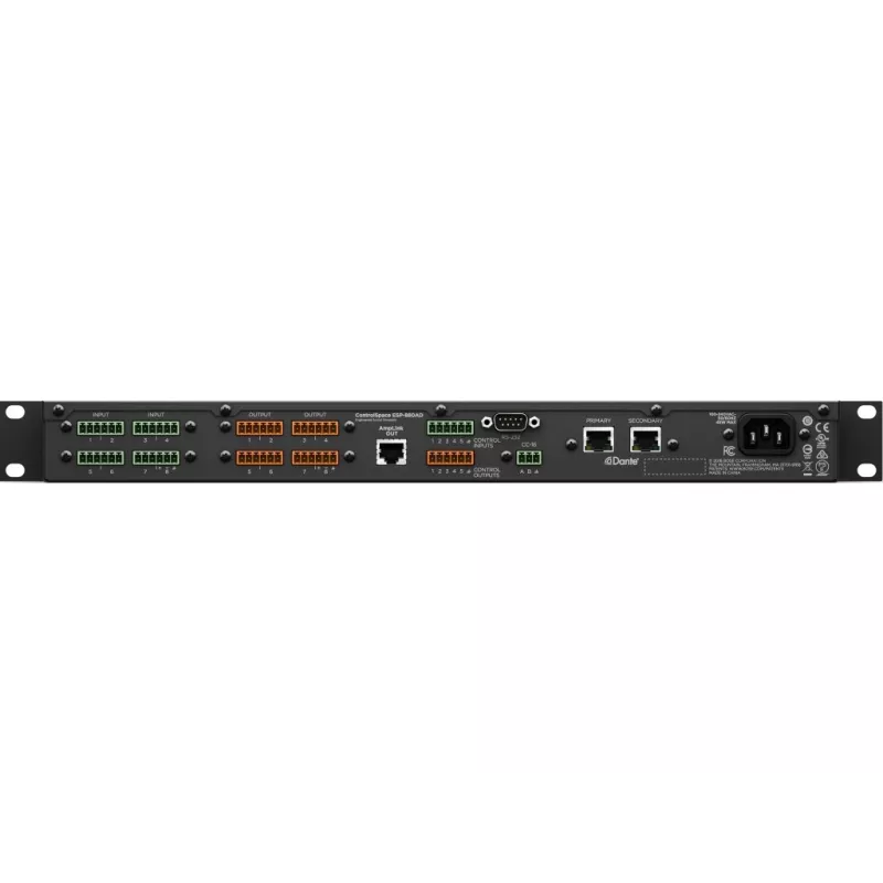 Il dispose d'un réseau audio Dante intégré, d'E/S audio analogiques 12x4, d'une sortie AmpLink de Bose et d'une connexion Ethernet RJ-45 en façade pour une configuration et une surveillance localisées.